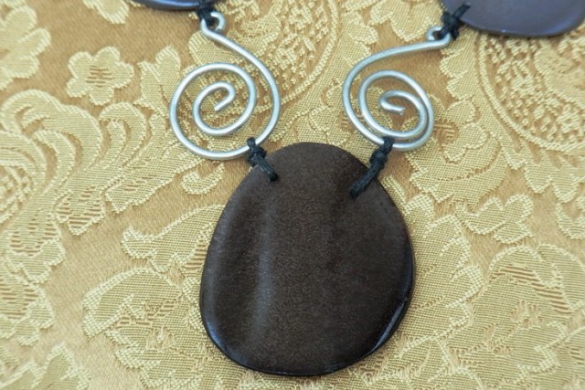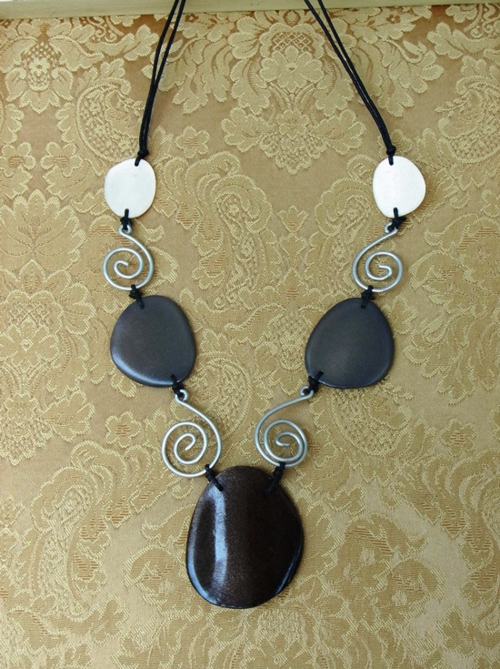フランスから輸入の個性的で大人キュートなネックレスシェルとウッドのパーツを渦巻き状のワイヤーモチーフでつなげてあります。カラーのグラデーションも素敵です。■サイズ:長さ:約50cm+アジャスター4cm素材: シェル・ウッド・真鍮・ロー引き紐
