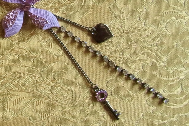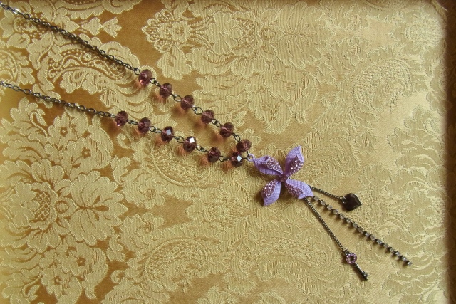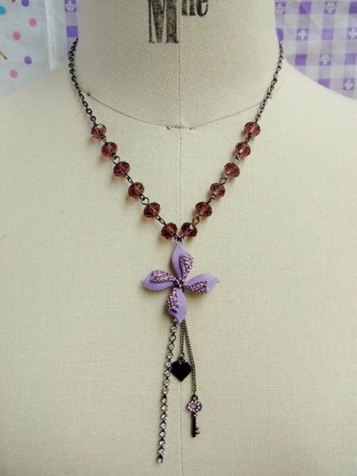 フランスから輸入の個性的で大人キュートなネックレスパープルのフラワー、ユラユラと揺れるハート・鍵・ラインストーンのチャーム...エレガントでキュートなモチーフがたっぷりのネックレスです。
