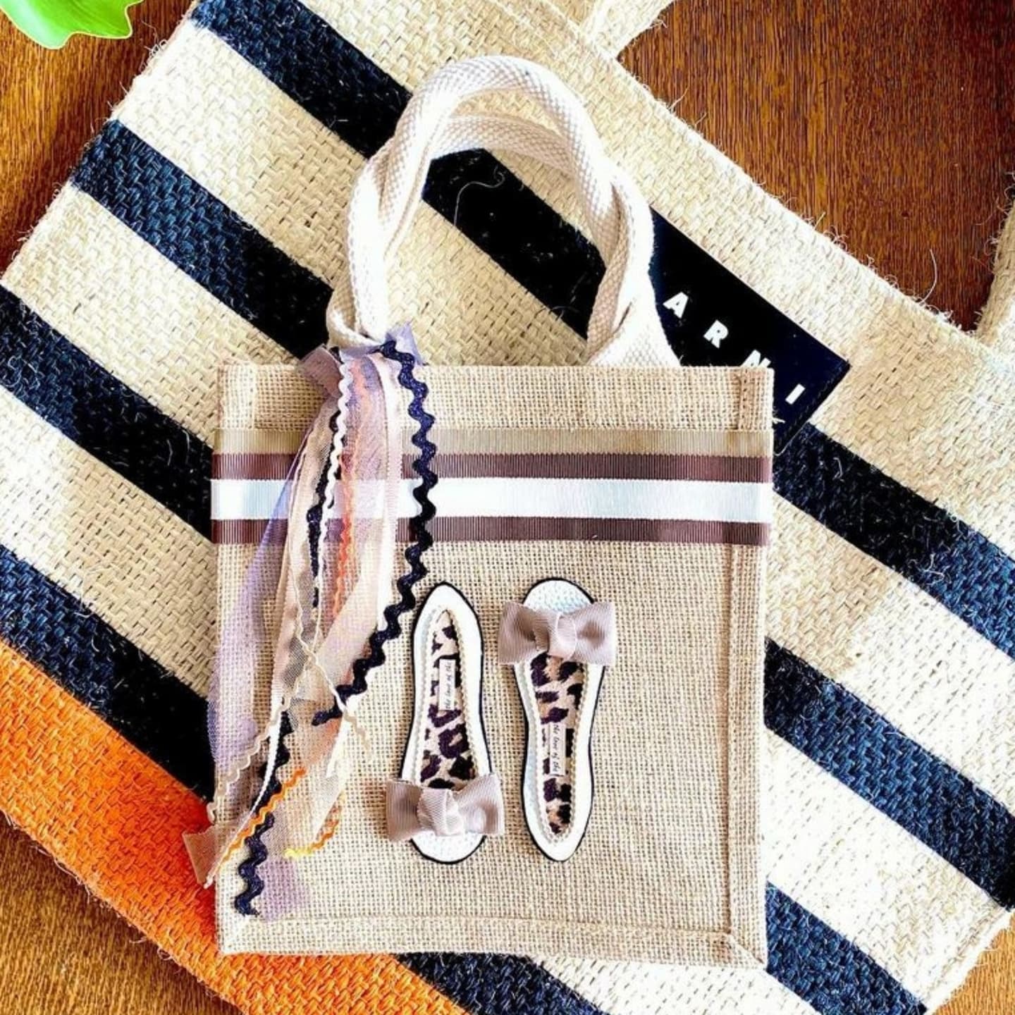 靴モチーフを製作して、リボンなどと一緒にA6のジュートバッグに貼り付けます。